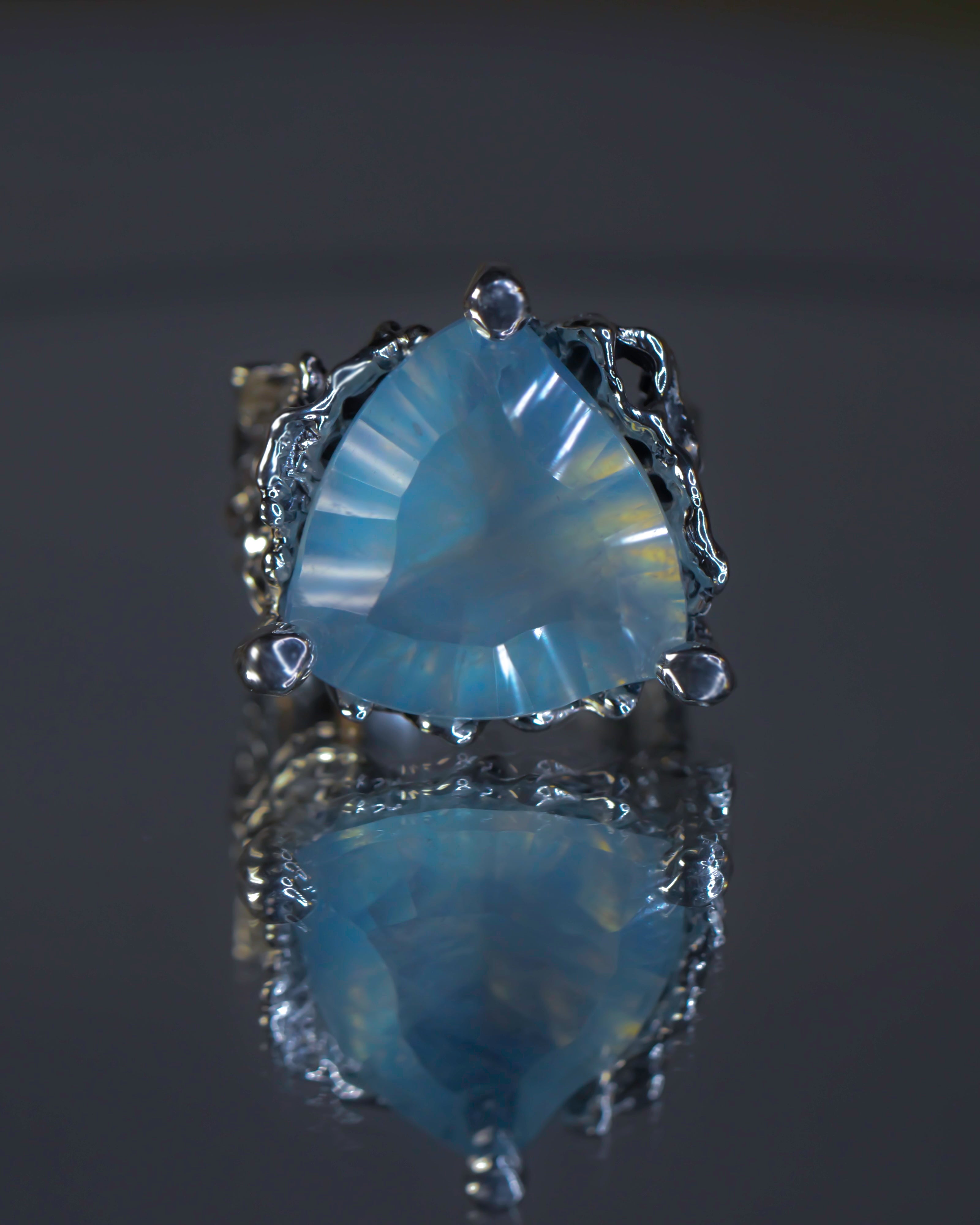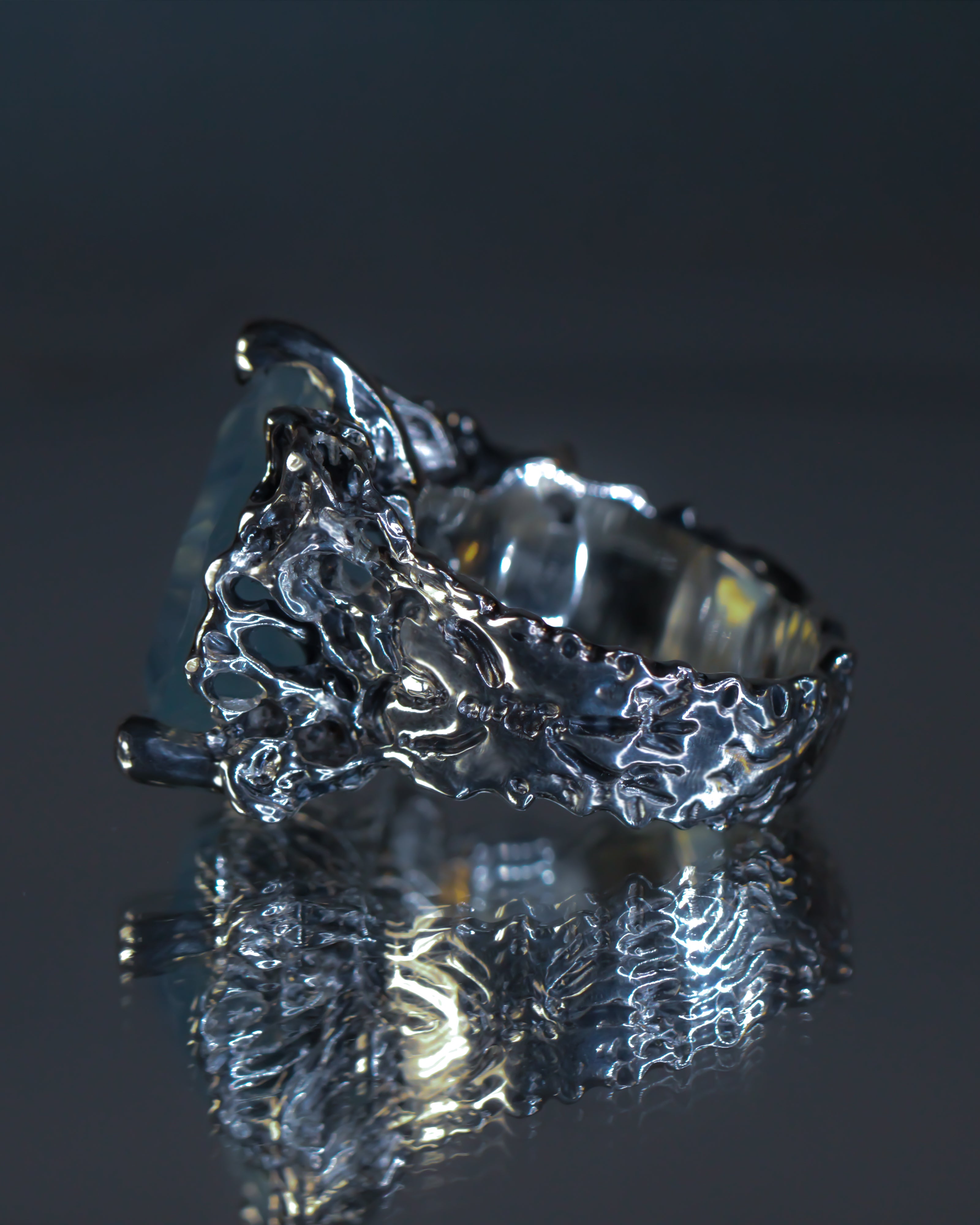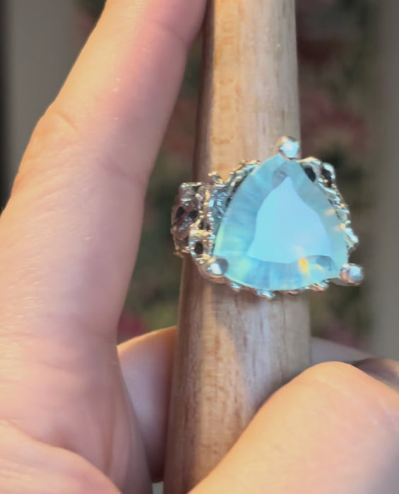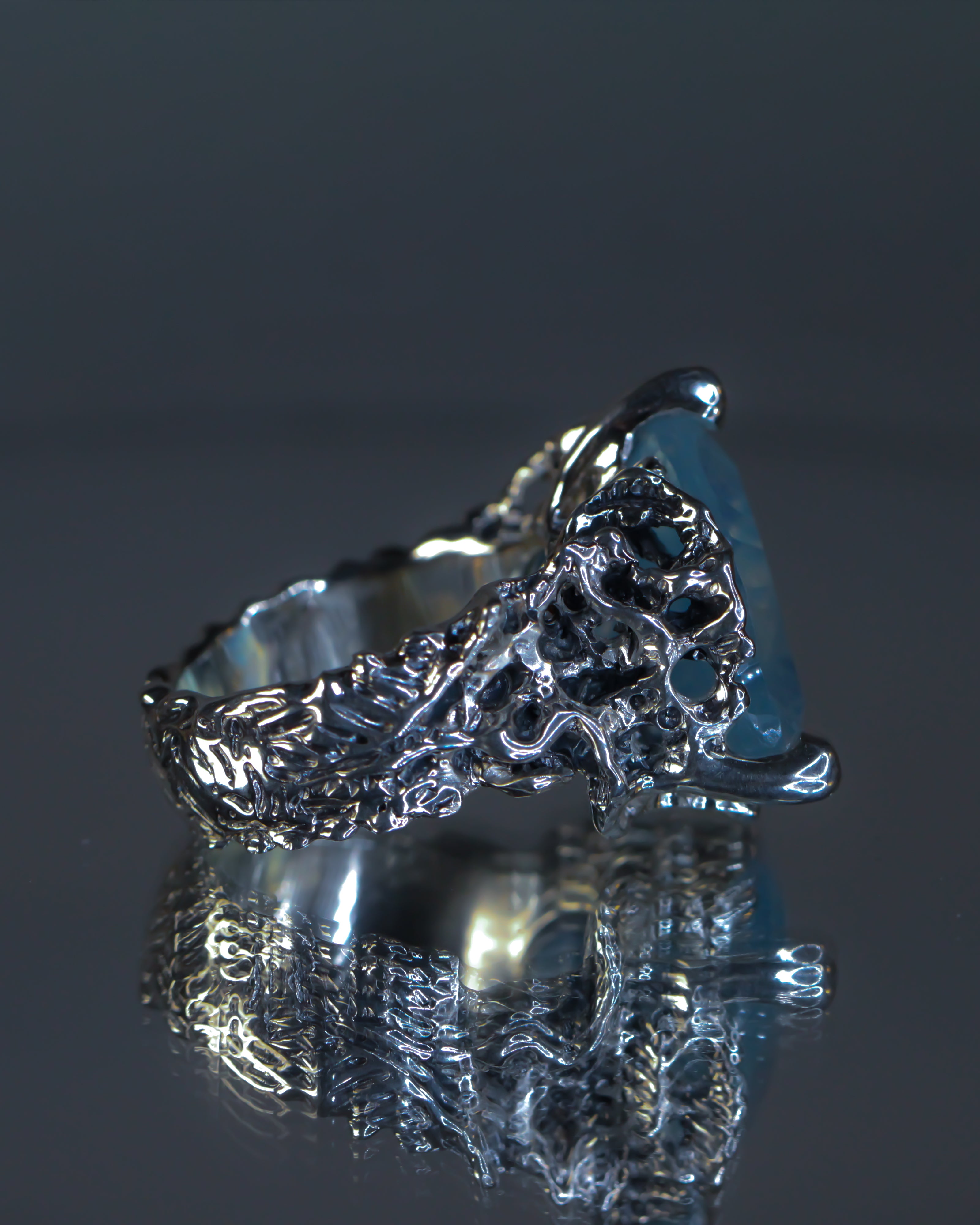 It features a 20mmx20mm, concave cut Aquamarine. This is a large statement ring. See video for scale