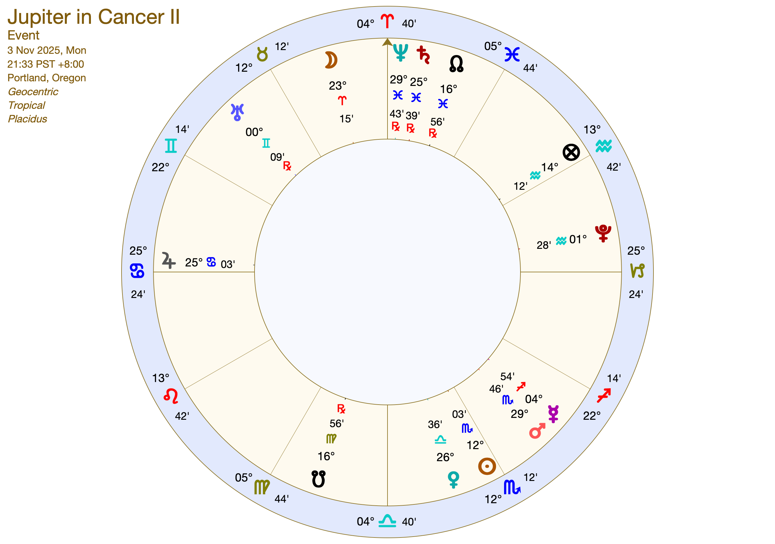This ring was created during the elected time of November 3, 2025, at 9:33 pm in Portland, Oregon, during the Hour of Jupiter. Jupiter rises on the Ascendant in his exaltation in Cancer, and is also within his own bounds — a condition that gives greater agency in worldly affairs and strengthens his capacity to operate on his own terms.